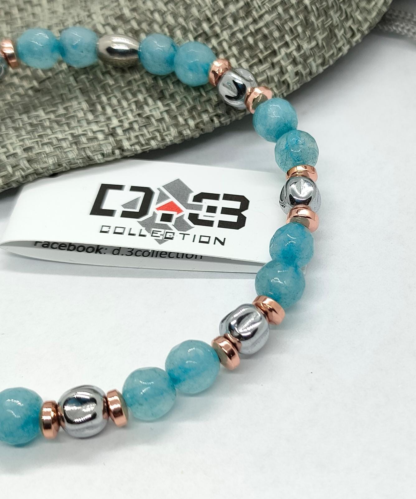 Materiale: Agata Sfaccettata Azzurra, Ematite argentata, separatori in Ematite Oro Rosata . I distanziatori e la chiusura sono materiali anallergici e nickel-free.
