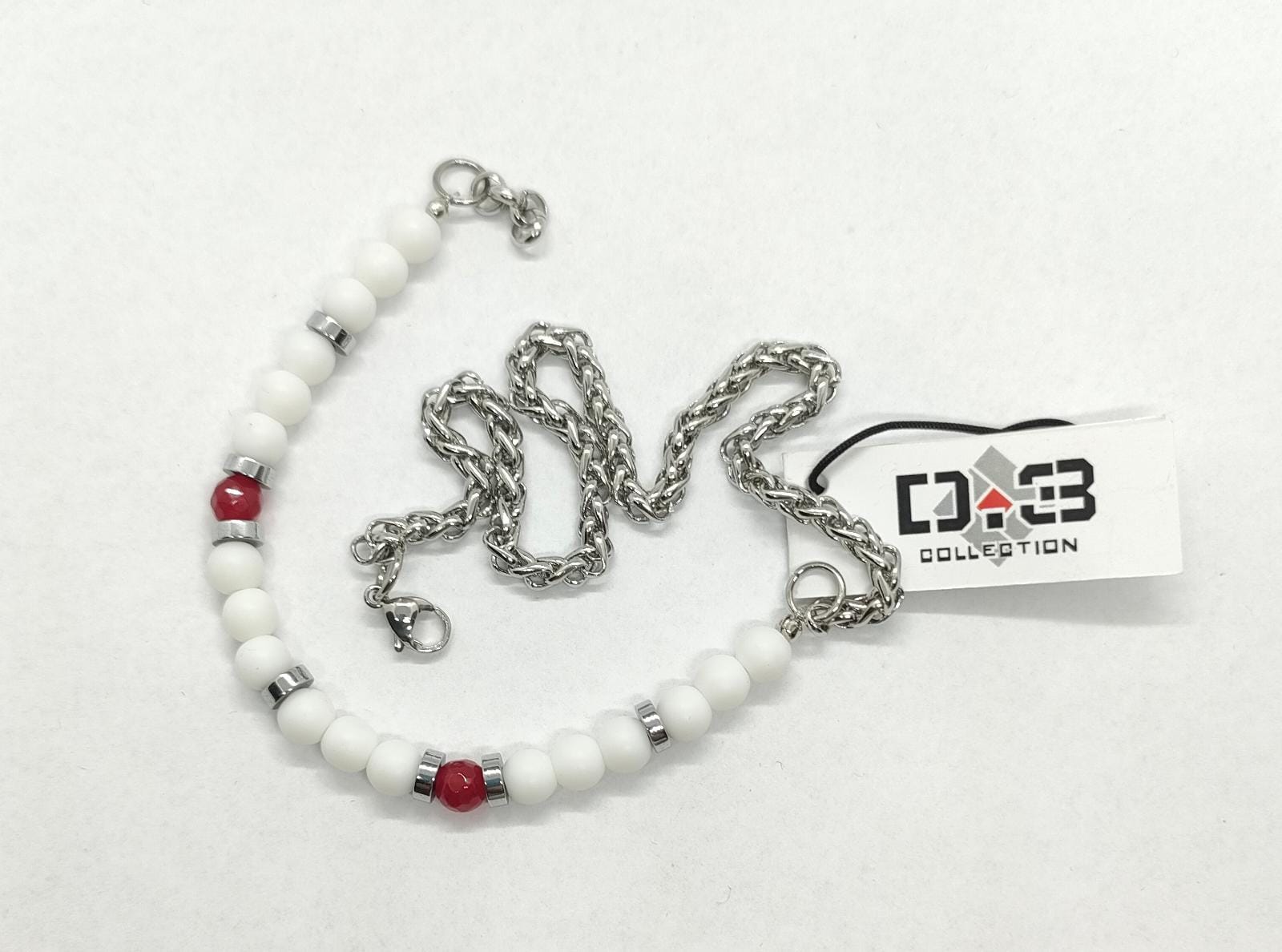 Materiale: Pietra di Onice Bianca Opaca, Agata Rossa e catena intrecciata in acciaio inossidabile. I distanziatori e la chiusura sono materiali anallergici e nickel-free.