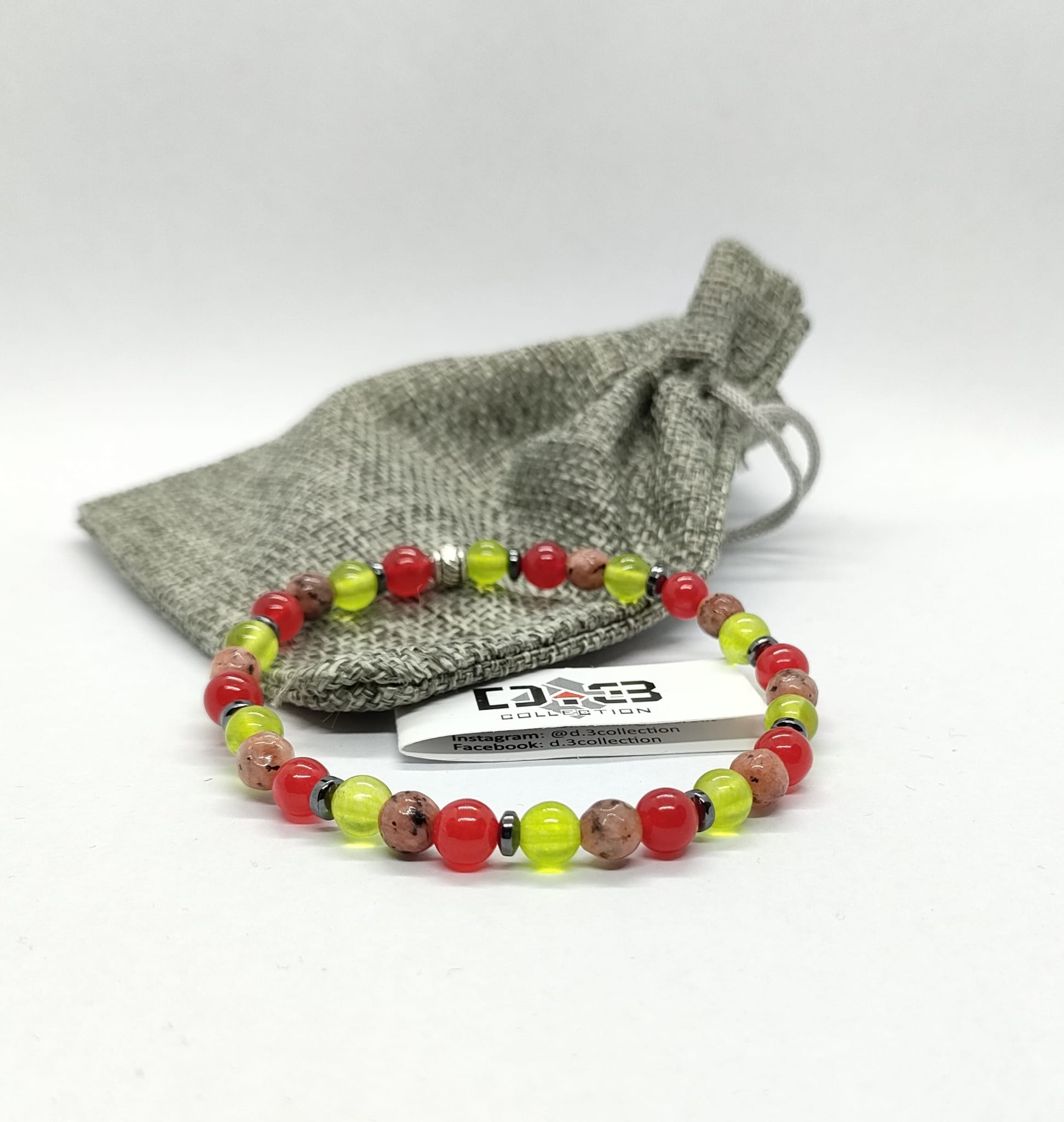 Materiale: Agata Arancione Sfaccettata, Agata Gialla Liscia e Pietra di Agata Rossa Liscia. I distanziatori e la chiusura sono materiali anallergici e nickel-free.