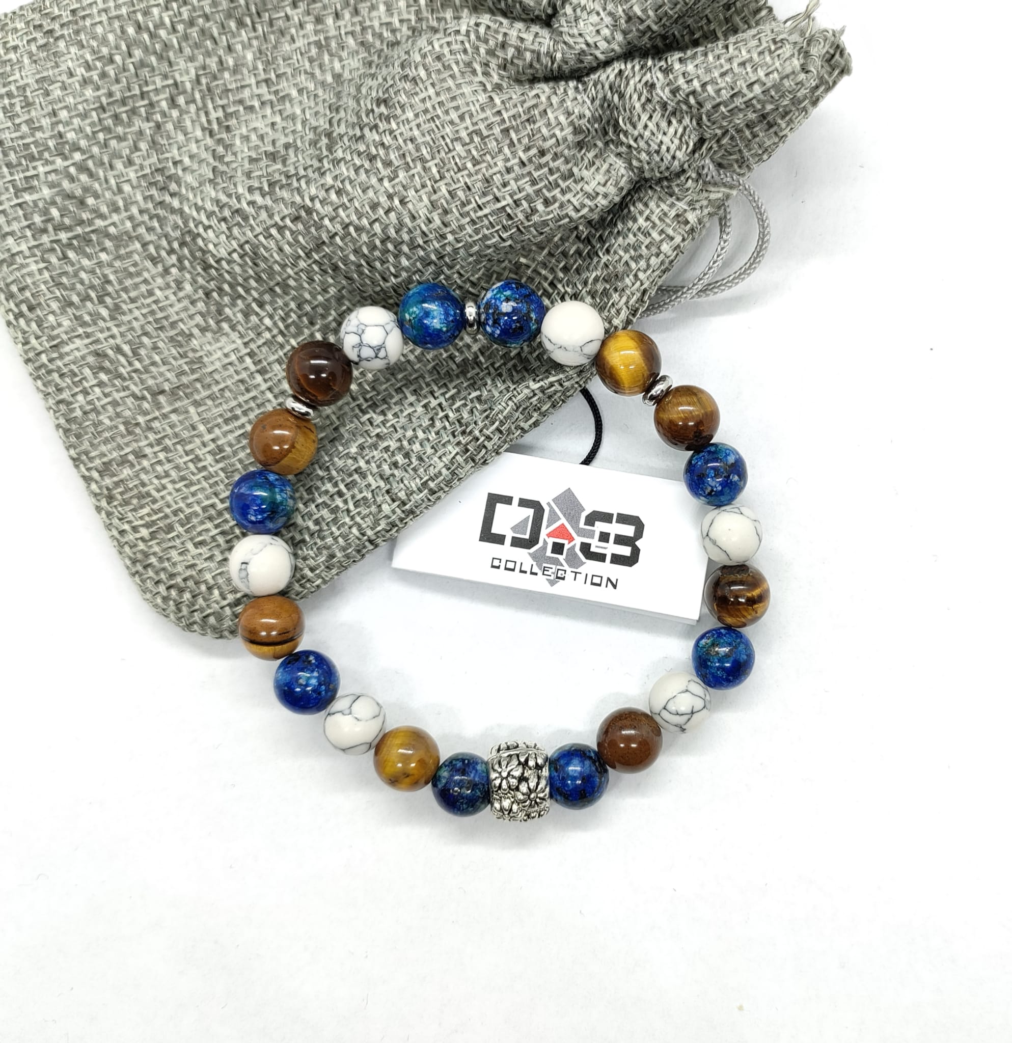 Materiale: Agata Blu, Howlite bianca con venature ed Occhio di Tigre. I distanziatori e la chiusura sono materiali anallergici e nickel-free.