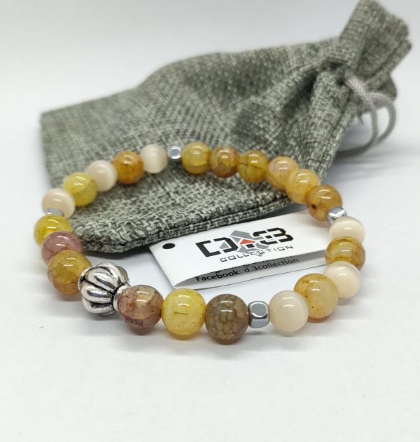 Materiale: Pietra Agata Giallastra con Venature, Pietra Occhio di Gatto Beige, Pietra Agata Beige con Venature, Cubetti in Ematite. I distanziatori e la chiusura sono materiali anallergici e nickel-free.