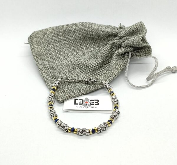 Materiale: Nodini in acciaio inossidabile intrecciati a mano e pietre di cristallino blu e rondelle in ematite dorata. I distanziatori e la chiusura sono materiali anallergici e nickel-free.