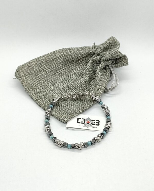 Materiale: Nodini in acciaio inossidabile intrecciati a mano e cubo di ematite. I distanziatori e la chiusura sono materiali anallergici e nickel-free.