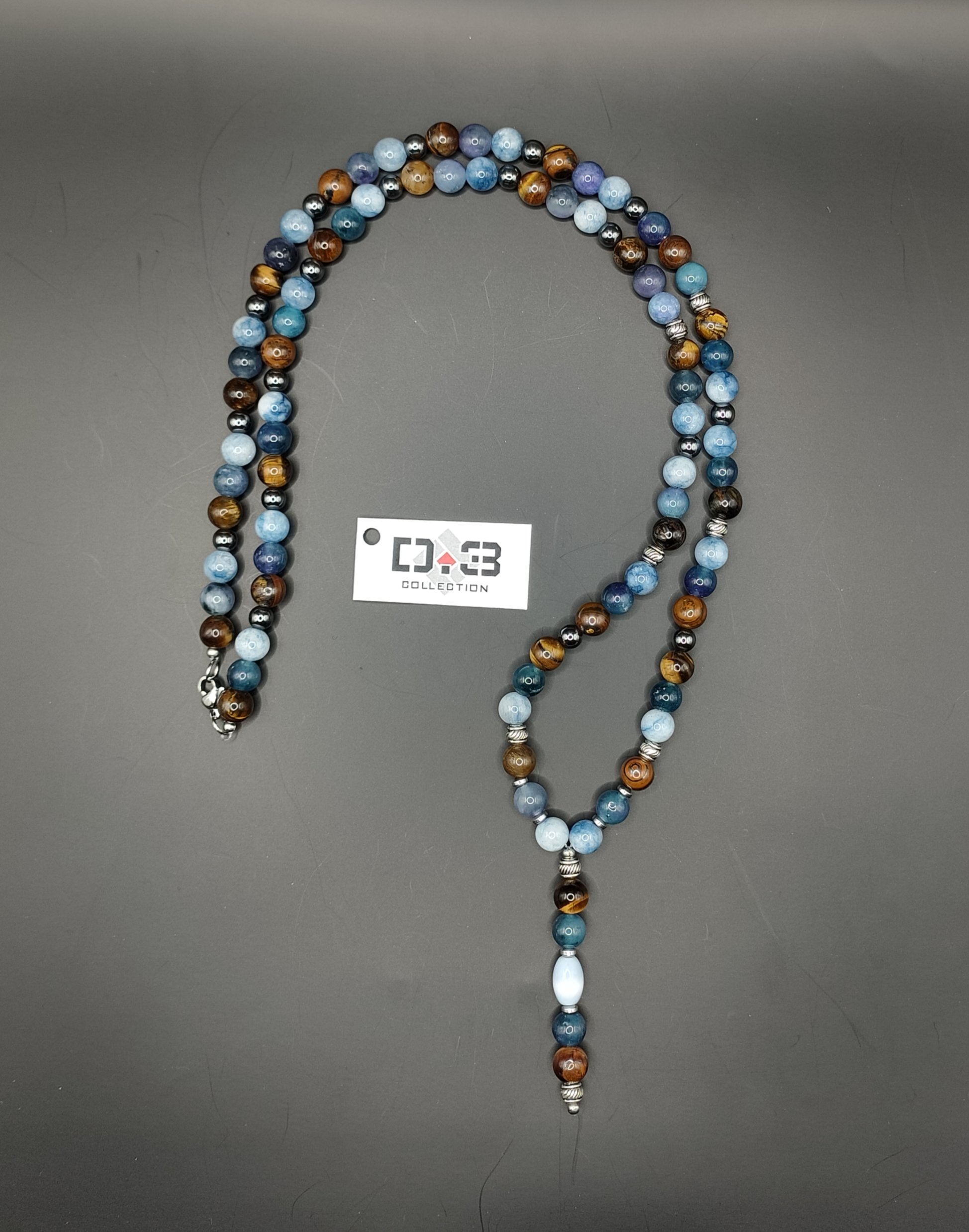 collana da uomo realizzata con pietre naturali da 8mm di occhio di tigre, agata blu ed ematite. Nuovo modello con prolungamento modello stile boho.